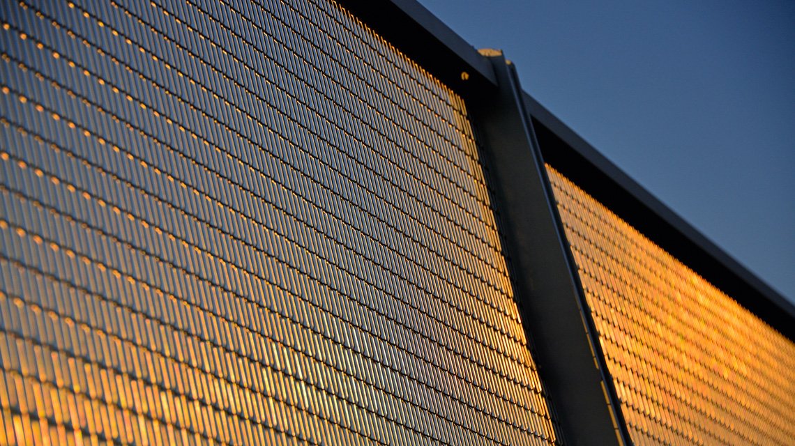 Dans cette réalisation, la maille accompagne la ligne de la passerelle comme un voile architectural continu, révélant toute sa finesse lorsque la lumière naturelle glisse le long du garde-corps.
