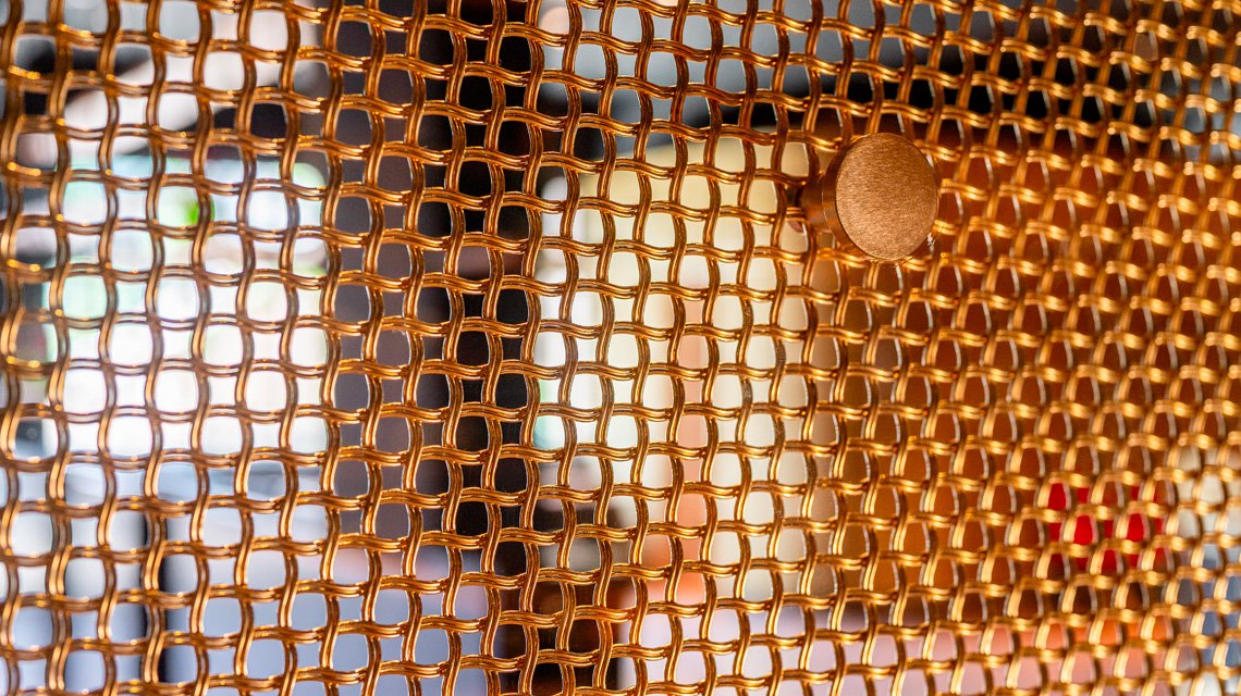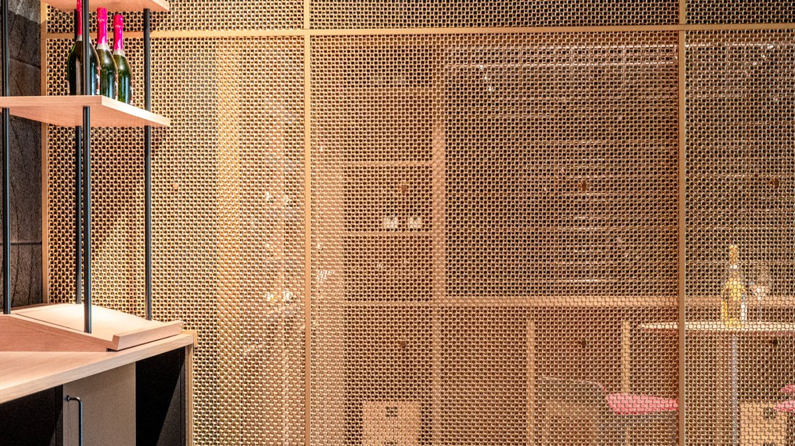La maille métallique M22-22 en laiton naturel y est utilisée comme séparateur d’espaces, structurant les volumes tout en conservant transparence et continuité visuelle.