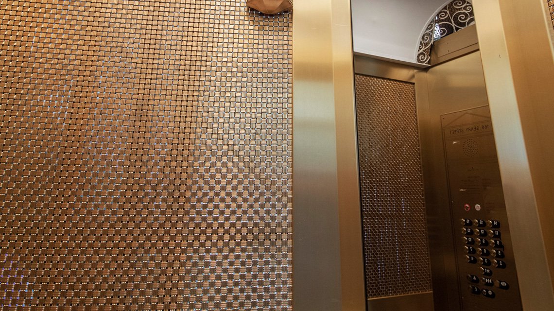 Lumineuse, élégante et incontestablement durable, la maille métallique M33-2 jour un rôle déterminant dans la rénovation minutieusement réalisée par l’entreprise Unique Elevator Interiors.