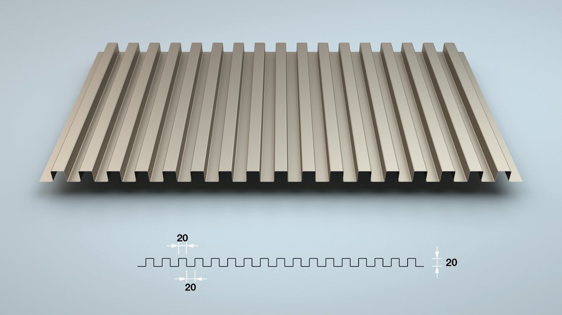 Idéale pour les habillages décoratifs, les plafonds design et les panneaux architecturaux nécessitant une présence visuelle plus marquée, la tôle ondulée SQ 20-20 présente une ondulation régulière de 20 mm, offrant un relief plus affirmé que les micro-profils fins tout en conservant une esthétique sobre et contemporaine.