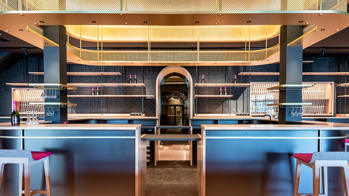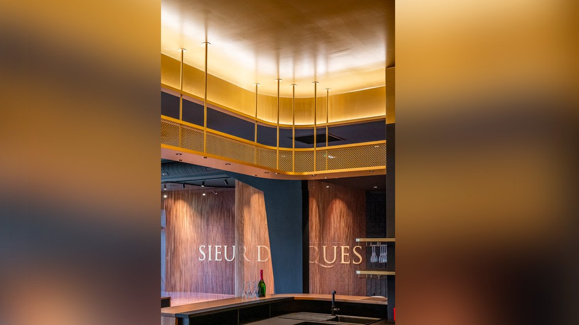 Au cœur de l’espace de dégustation, la maille métallique en laiton naturel se déploie en plafond suspendu, formant un véritable ciel de bar aux lignes courbes et enveloppantes.