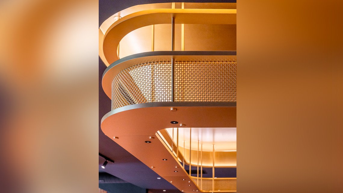Élément à la fois technique et décoratif, le ciel de bar en maille métallique révèle ici tout le potentiel de ce matériau en architecture intérieure : structurer sans cloisonner, habiller sans alourdir, et accompagner la lumière pour sublimer l’expérience.