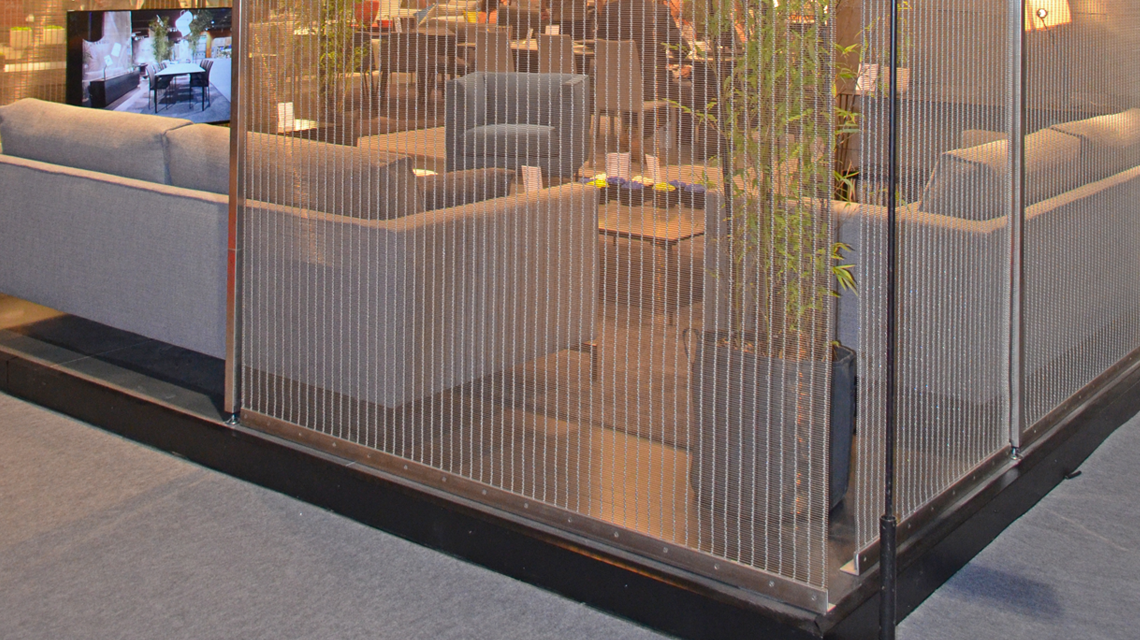 Création de cloisons sur mesure en maille métallique inox câblée SAGITTARIUS P11432, pour le stand de l’entreprise TRISS.