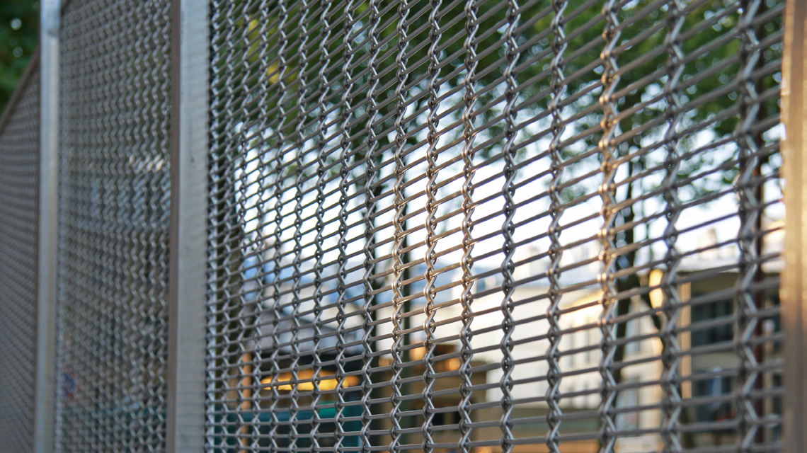 Réalisation d’une clôture en résille métallique inox câblée DA VINCI ALT, pour le Tribunal de Grande Instance de Versailles. La maille métallique câblée pour le paysage, le design extérieur. Lieu : Versailles