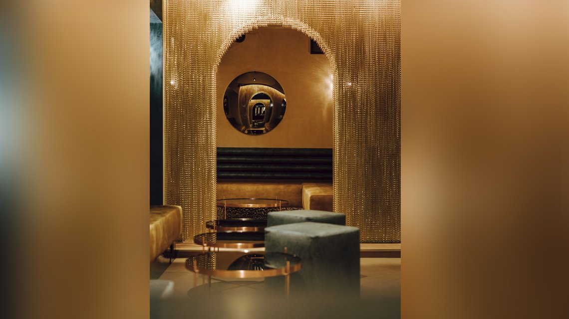 Le plafond métallique ondulé crée l’illusion d’une piscine flottante. Les arches inversées, le miroir sphérique proposent un concept de design déformé sublimé.