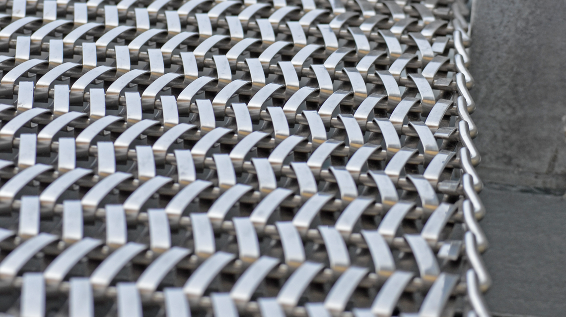 Habillage d’un escalier extérieur en résille métallique spiralée inox EIFFEL1550. Lieu : Neuilly-sur-Seine