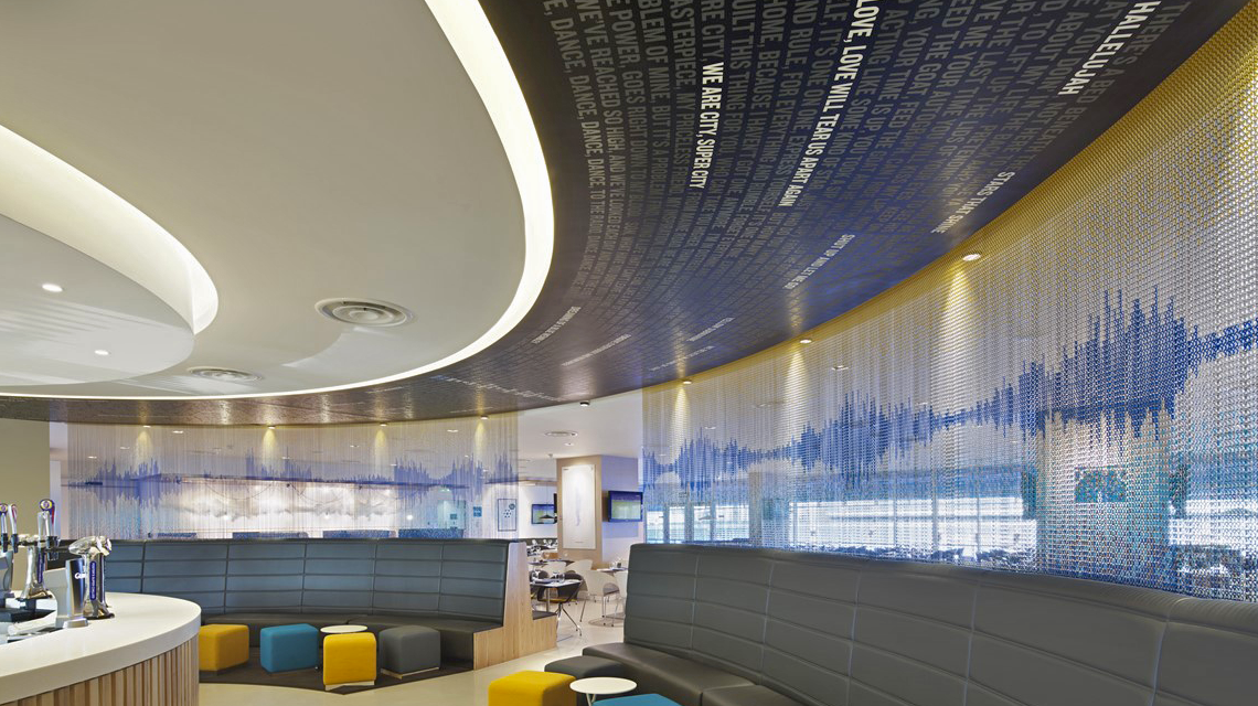 Belle mise en scène des chaînes à maillons sur lesquelles nous découvrons la reproduction de l’hymne national anglais, pour le club de Manchester. Projet signé : 20/20 Design Lieu : Manchester, Angleterre